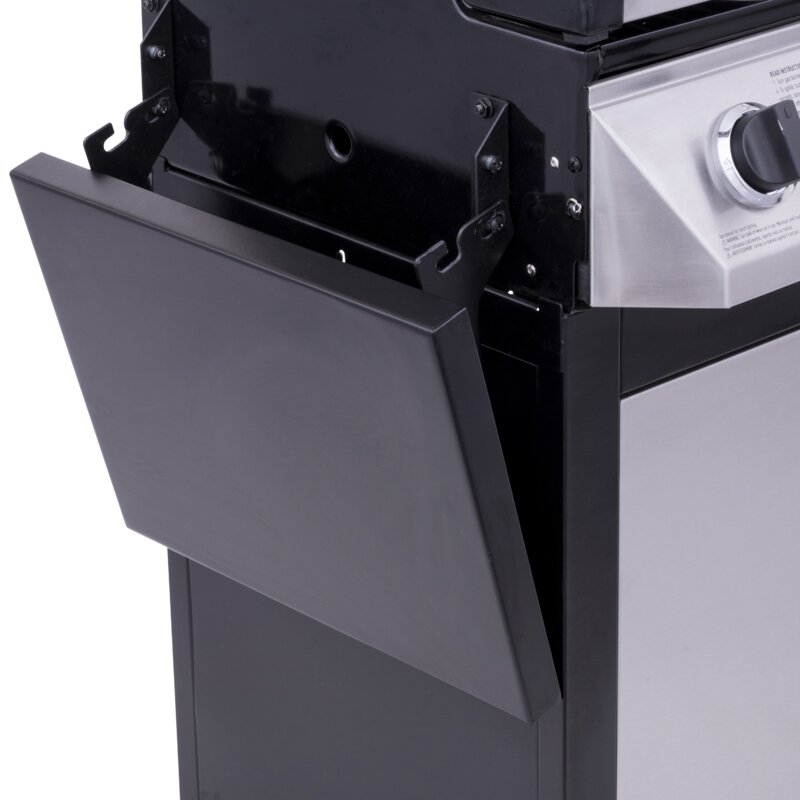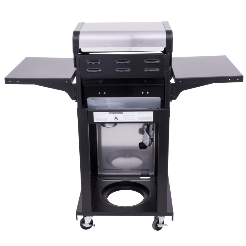 This 2-Burner Propane Gas Grill features 30,000 BTUs of cooking power spread across 300 square inches of cooking surface. Stainless steel burners are rust-resistant and the porcelain-coated grates keep food from sticking and are easy to clean. Equipped with folding metal side shelves, built-in tool hooks for storage, a Piezo ignition system, and porcelain-coated steel lid and firebox designed to withstand the elements. This grill also features two locking casters for easy portability.