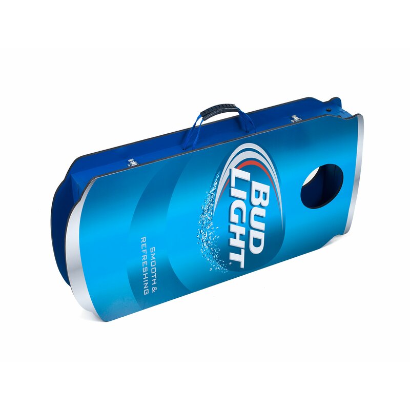 Enjoy outdoor fun for all ages with this 1.58′ x 3.08′ Bud Light Manufactured Wood Cornhole Board. Bean bag toss or cornhole is the perfect game for your next cook-out, picnic or tailgate. It’s easy to play and fun for all ages. This set includes 2 durable wooden board which feature the iconic can shape. These boards hinge together and latch for easy suitcase style transport to your next outdoor function.