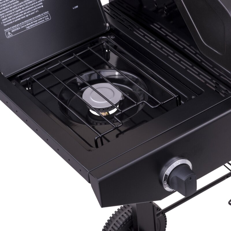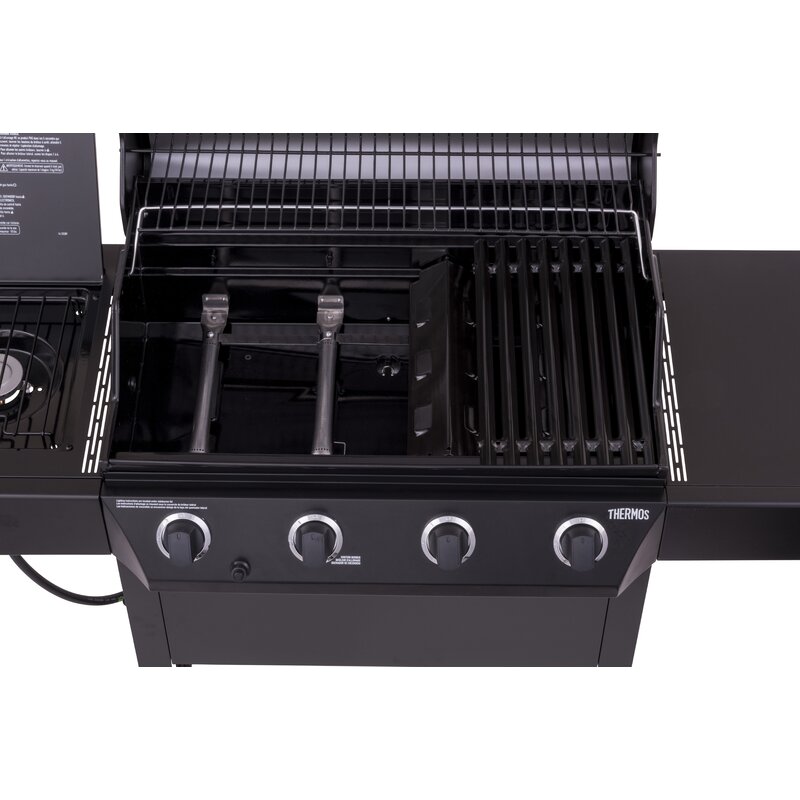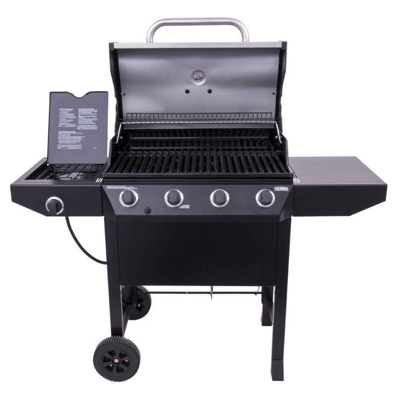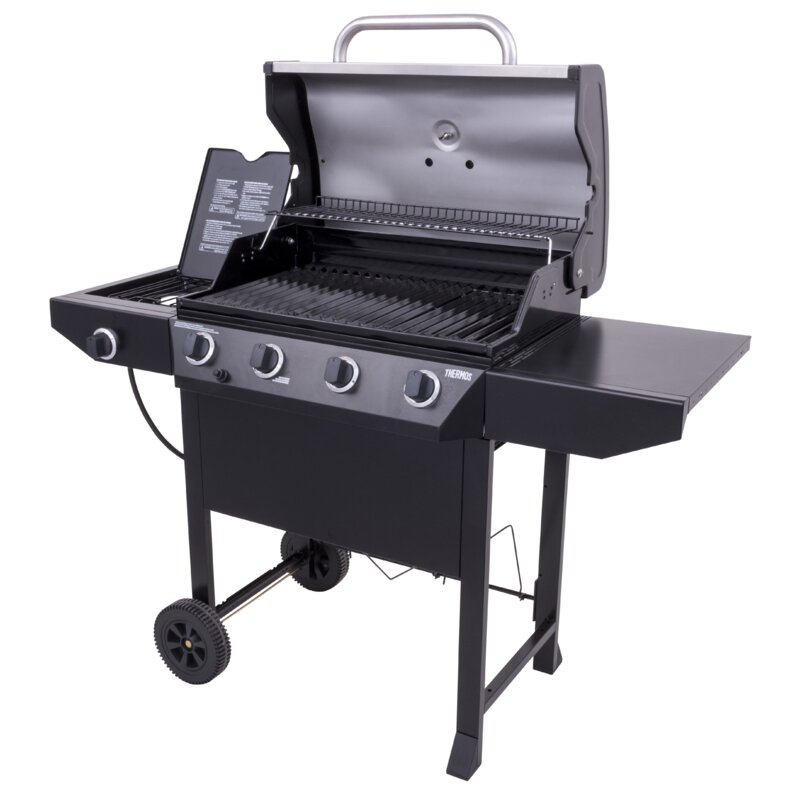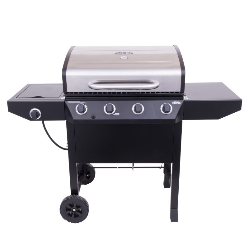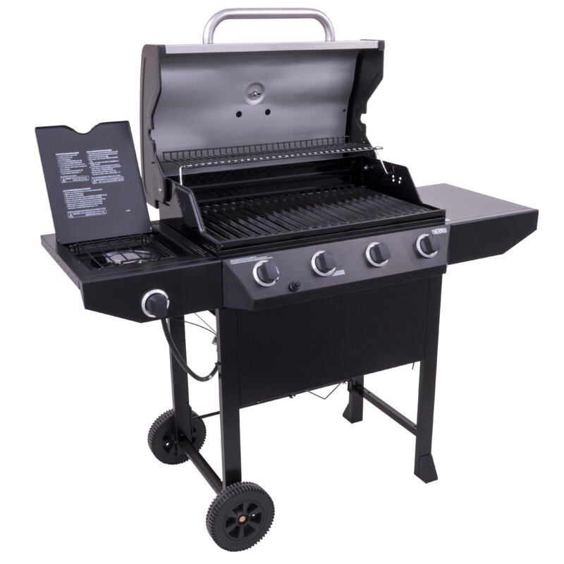 This 4-Burner Propane Gas Grill features 48,000 BTUs of cooking power spread across 480 square inches of primary cooking space. Stainless steel burners are rust-resistant and the porcelain-coated grates keep food from sticking and are easy to clean. Equipped with a 10,000 BTU side burner, metal side shelves, built-in tool hooks for storage, a Piezo ignition system, and porcelain-coated steel lid and firebox designed to withstand the elements. This grill also features two 6 inch wheels and stationary legs for easy portability and stability.