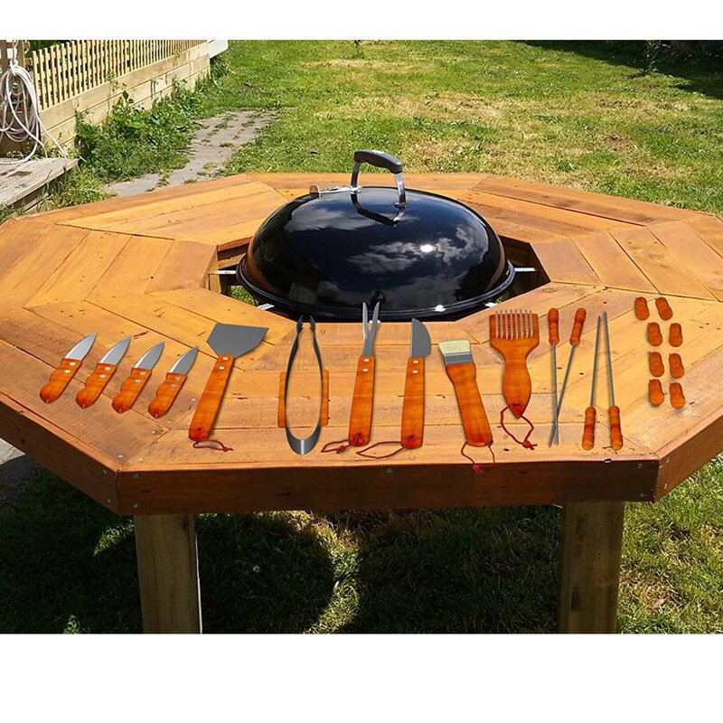 This grilling tool set with 4 steak knives has all the essentials you need for a successful summer cookout. Each tool is made from high quality and durable stainless steel with riveted wood handles for rust-resistant, long-lasting use. This set includes 18 BBQ tools like a spatula, tongs, skewers, corn holders, basting brush which can all be stored in the included heavy-duty carrying case. The full set also includes 4 steak knives for when you cook up perfectly seasoned meals. It is the perfect gift for anyone who loves to grill outdoors or for occasions like birthdays, wedding showers and more.