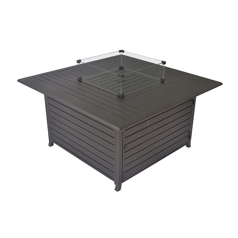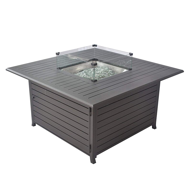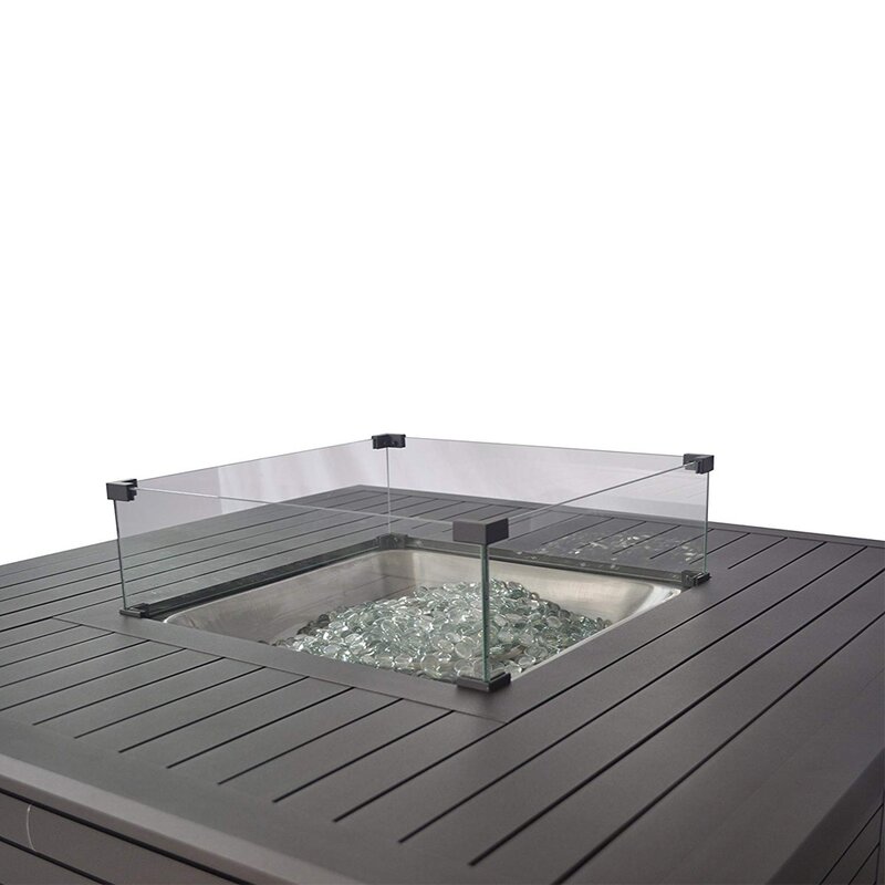 Used as a fire pit and also a dining set table with the lid added to the fire bowl. Easy access door on the side for gas tank exchange, and hidden tank from visible. All aluminum structure prevents rust and stainless steel burner for years lasting. Included with a heat resistant glass wind guard protects flames from blowing around in the wind. A weather protection cover for storage. Glass wind guard provides a high-quality gas fire pit accessory to help enhance your outdoor fire feature.