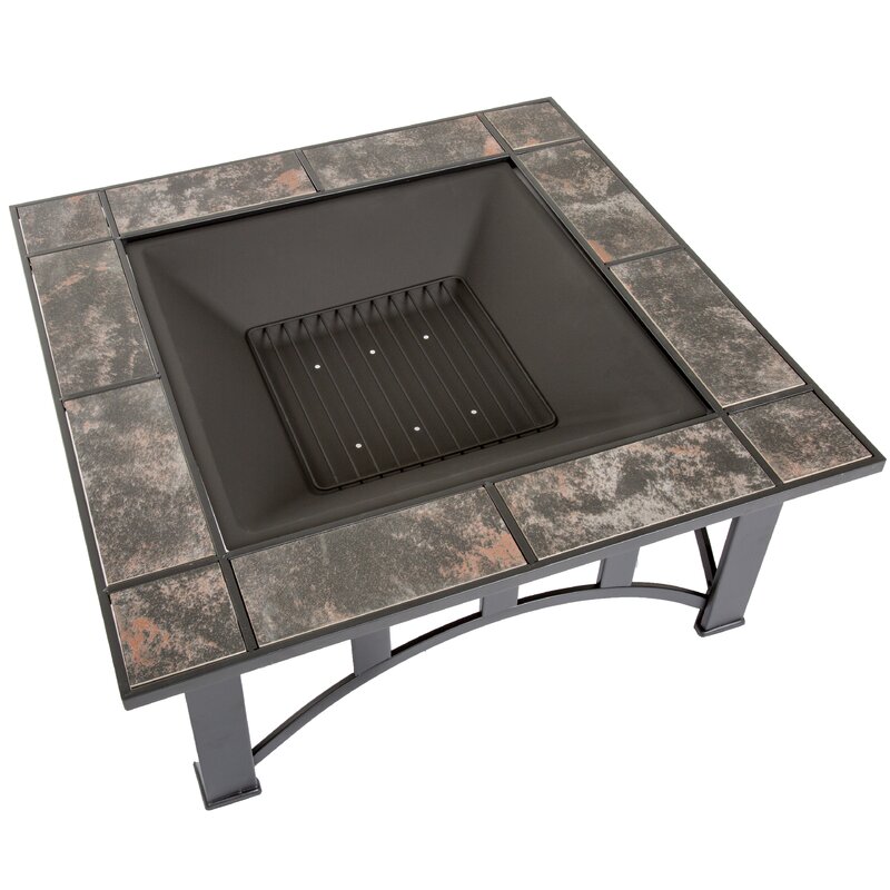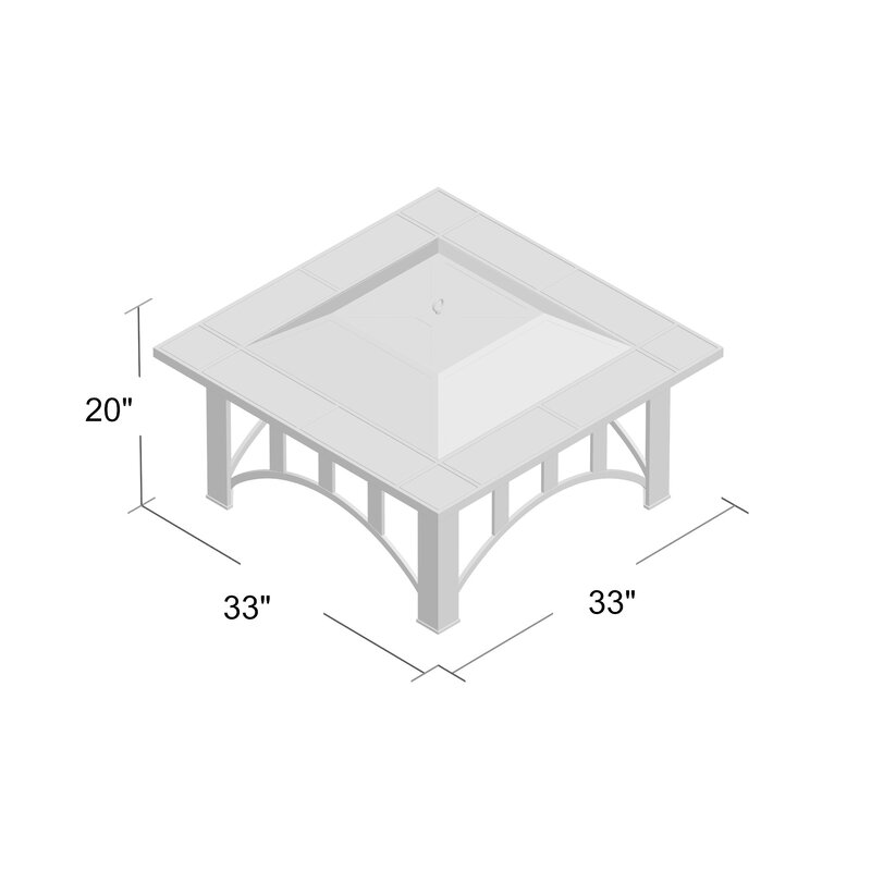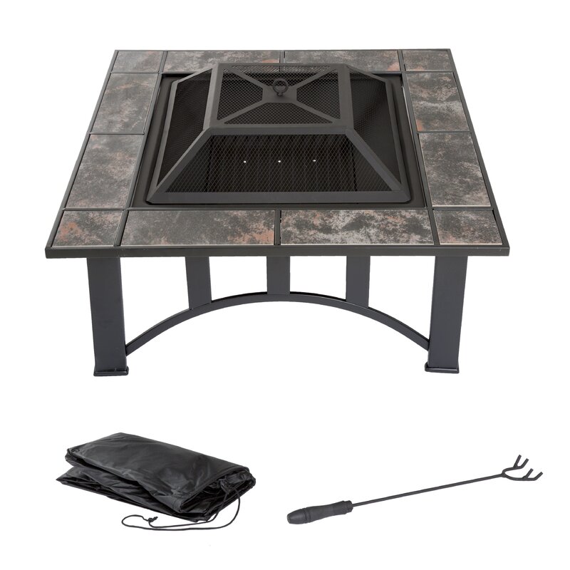 - PRODUCT DETAILS – Fire Pit dimensions: 33″ L x 33″ W x 14″ H, 20” H (with safety screen). Fire Bowl Dimensions: 22.5” (diameter), 4.5” (depth). Material: Powder Coated Steel Frame, Resists Rusting. Black and Orange Marbled Tile Top. Include safety log poker, log grate, spark screen, protective cover made of weather-resistant PVC, and assembly hardware. Assembly required.