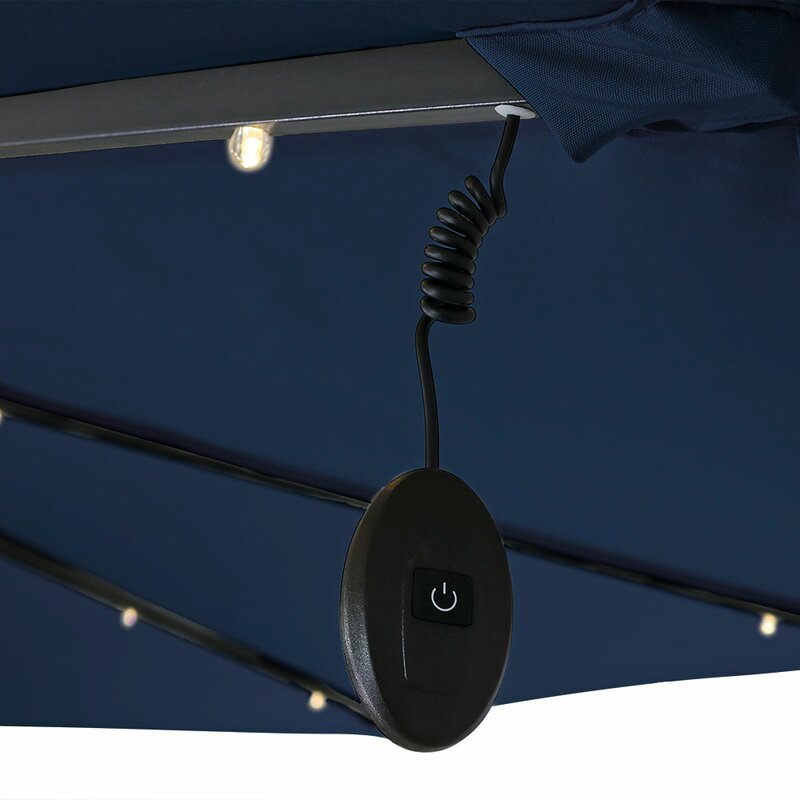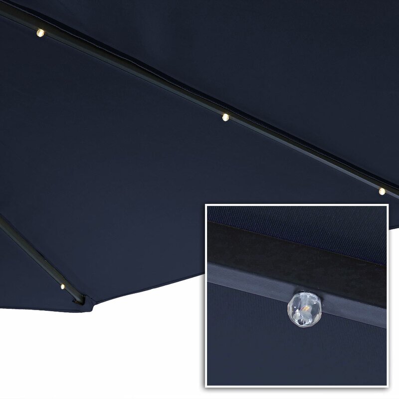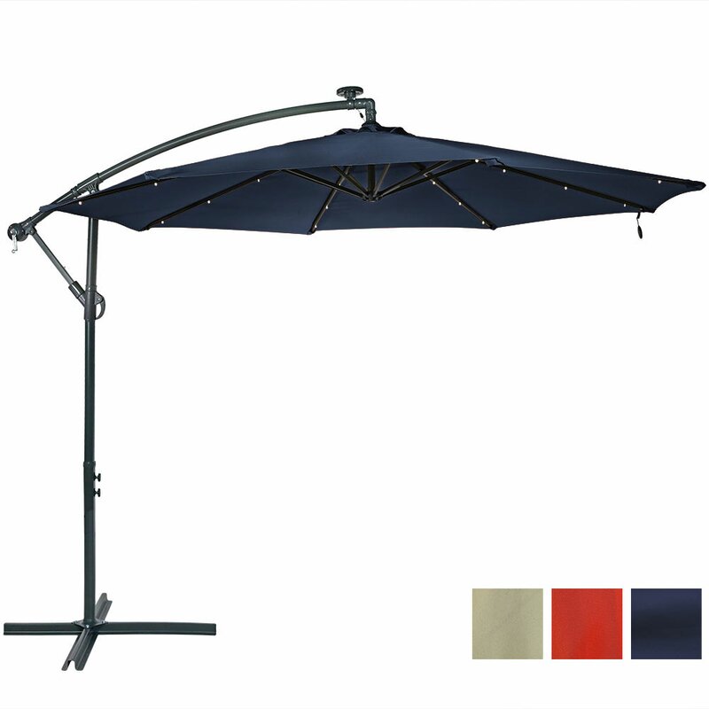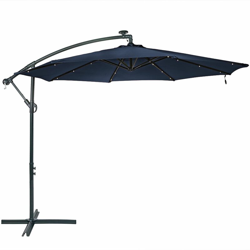 Have your patio made in the shade with this 10.5′ cantilevered umbrella! Crafted from sturdy steel in a weather-resistant powder-coated finish, it sits atop a telescopic pole body complete with an arched and angled arm. A simple crank lift opens the navy blue polyester umbrella with the help of metal ribbing, while a wind vent lets gusts pass right through to help keep it upright and balanced. Rounding out the design, a built-in, battery-operated light (batteries included) helps keep the party going even after the sun’s gone down.