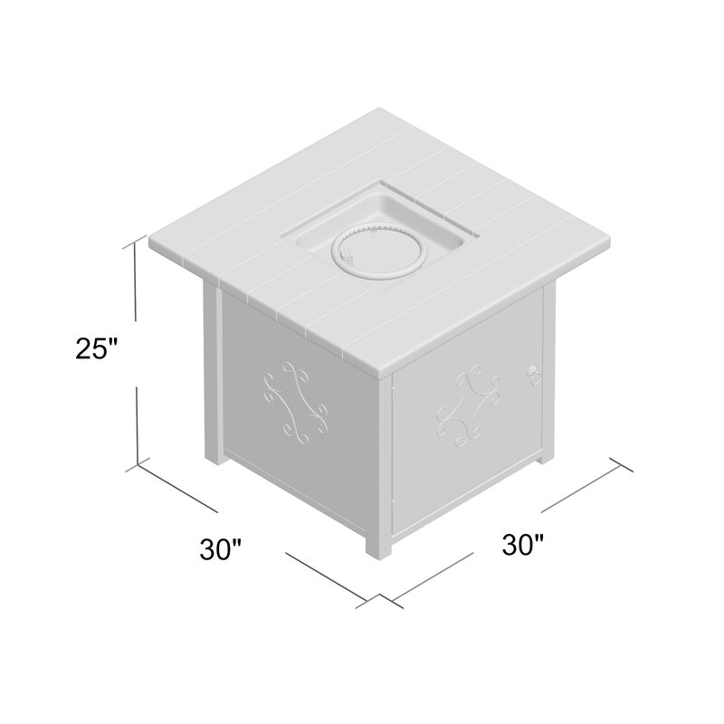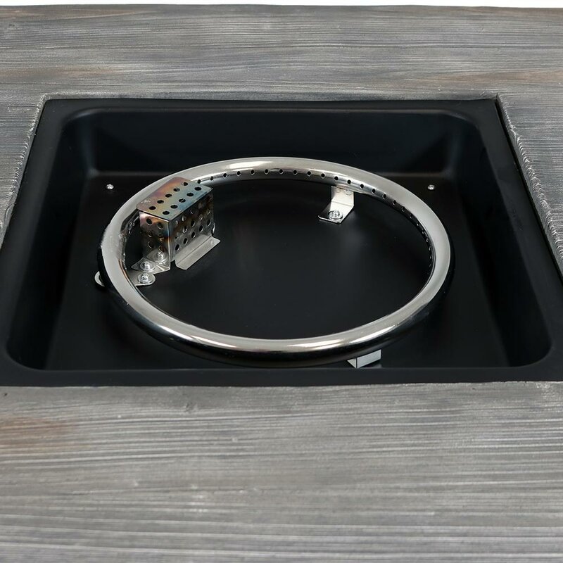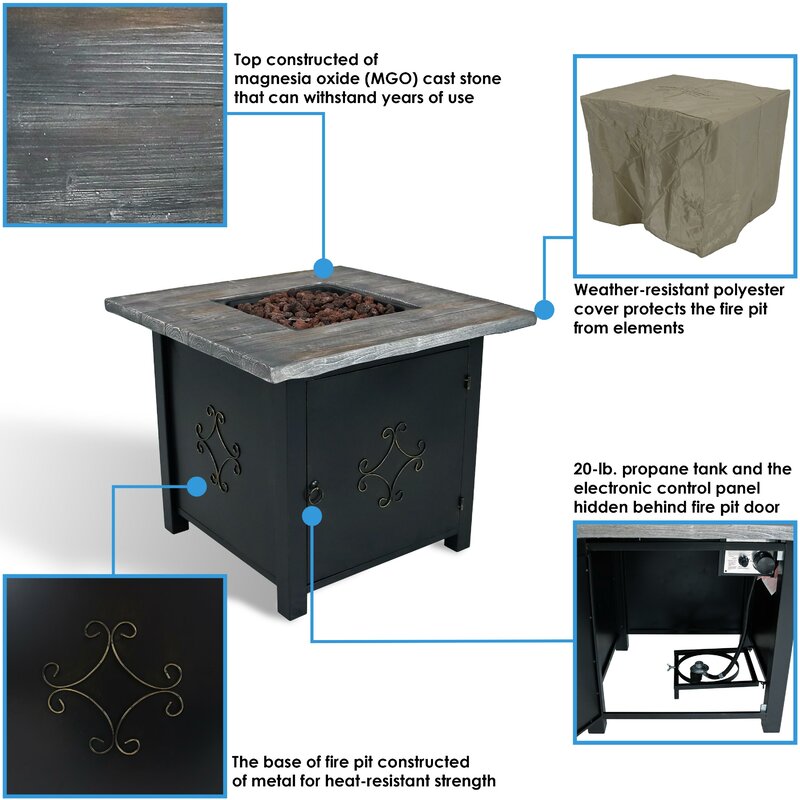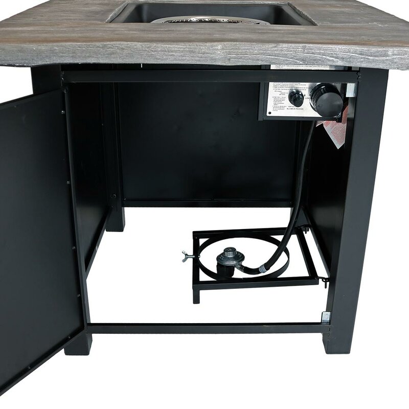 This liquid-propane-fueled gas fire pit table will add warmth and style to your patio backyard or outdoor space. The unit features a durable and attractive cast stone top with metal base frame and resin wicker panel door with the knob as well as a hidden electronic control panel and ignition switch. Your 20-pound LP tank will be safely out of sight behind the door so you can enjoy the fire pit without any eyesores. Each unit comes with a stainless steel burner a battery for the ignition a weather-resistant polyester cover lava rock and a 16-inch gas hose with regulator. To use the fire pit once your propane tank is hooked up push the flame control knob in a counter-clockwise rotation to low and then push the igniter button until flame lights.