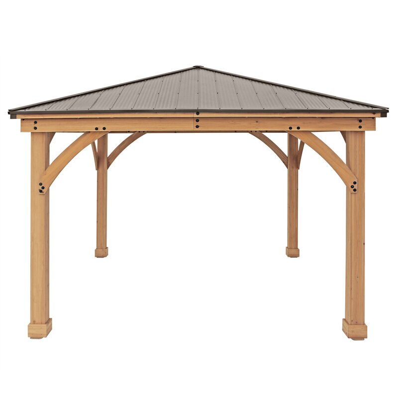 Expand your outdoor living space with this product. The Wood Gazebo with aluminum roof adds character to any area, creating the perfect setting for all your outdoor entertainment needs. The stunning design features an aluminum roof, 6” x 6” posts, and heavy corner gussets. The 100% Cedar Lumber is finished with a beautiful natural cedar stain that brings warmth and distinctive feel to any space. The illustrated step-by-step instructions will guide you through every step of the installation. The Meridian Gazebo with aluminum roof by Yardistry is a multi-functional product that is perfect for any outdoor space.