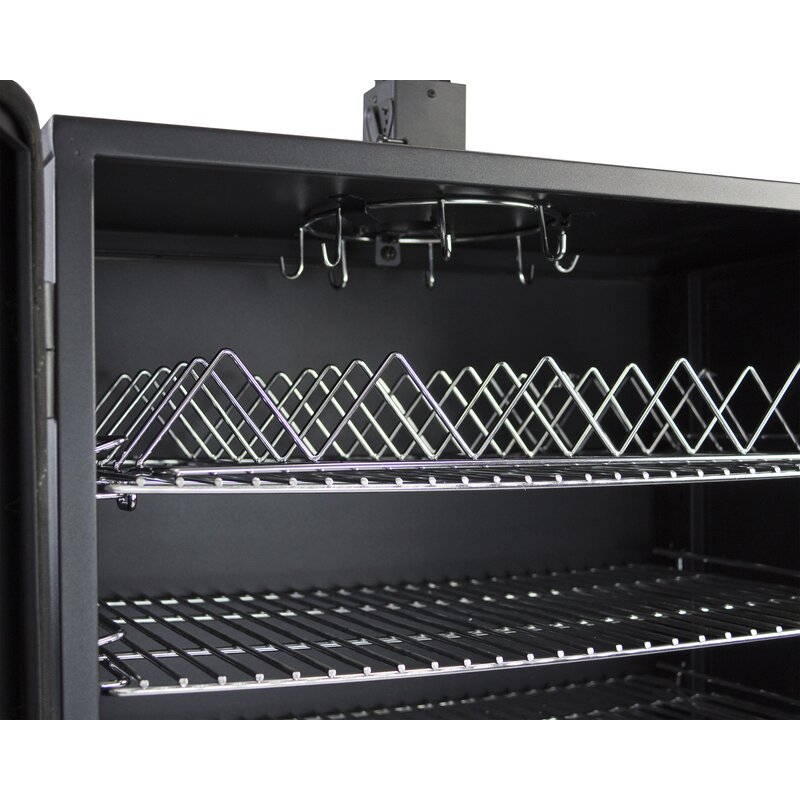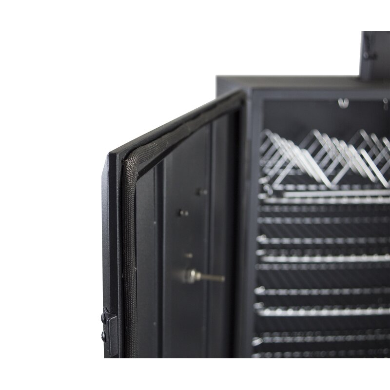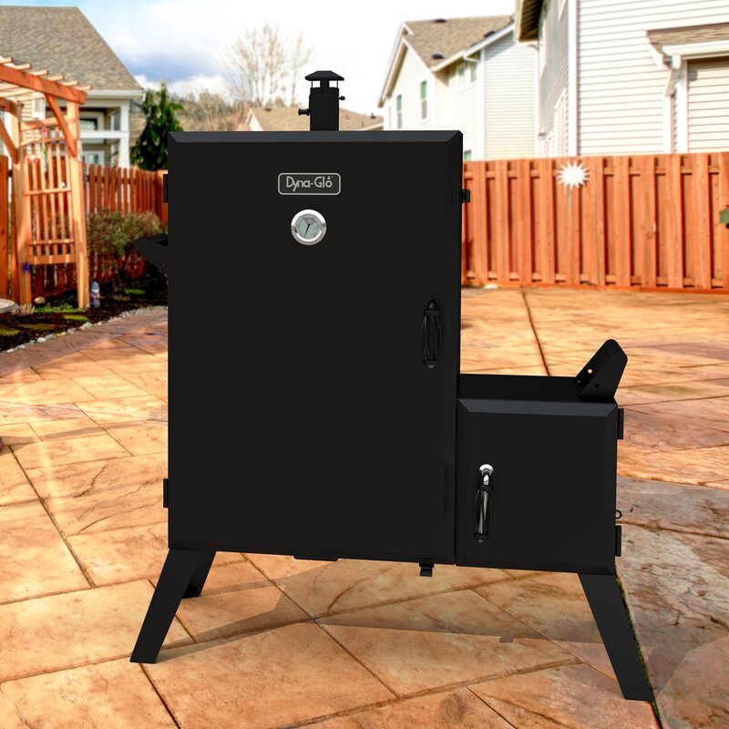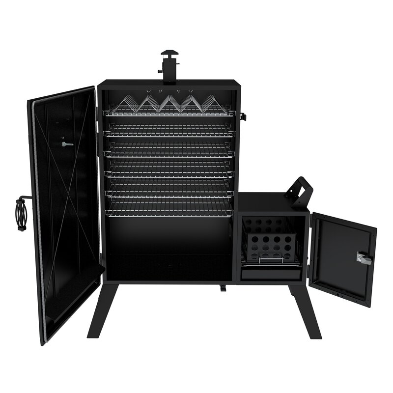 Charcoal enthusiasts, take heart! With this Dyna-Glo vertical offset smoker, you can now smoke your favorite foods with fuel source, charcoal! Vertical smokers are ideal for capturing maximum smoke flavor, so we’ve included 6 height-adjustable cooking grates, with a total of 1,890 square inches of cooking space, to accommodate different sizes and types of food. The pre-installed door seal helps retain heat and minimizes smoke loss for improved cooking efficiency. Since indirect heat is ideal for slow cooking (and infusing smoke flavor), the offset functionality of this smoker is designed to keep direct heat away from the food, which helps to prevent food on the bottom racks from cooking too fast. The porcelain enameled charcoal chamber is designed to keep briquettes stacked tightly for improved burn efficiency. The removable, steel ash pan is designed to handle large amounts of ash for hours of maintenance free cooking.