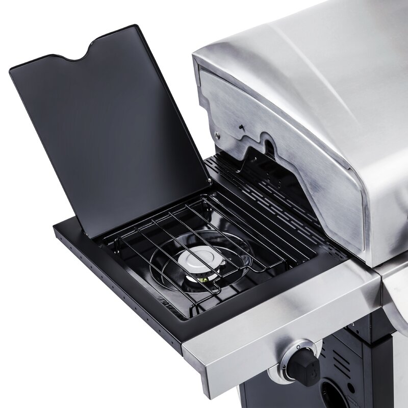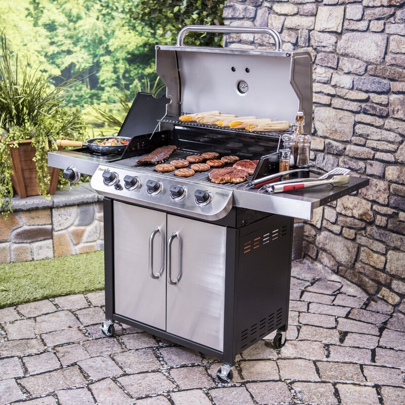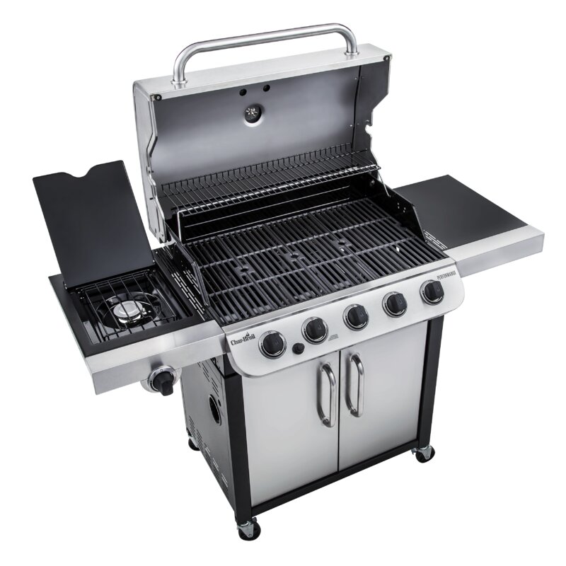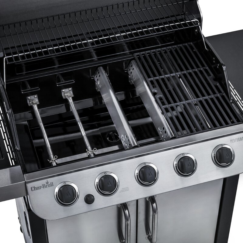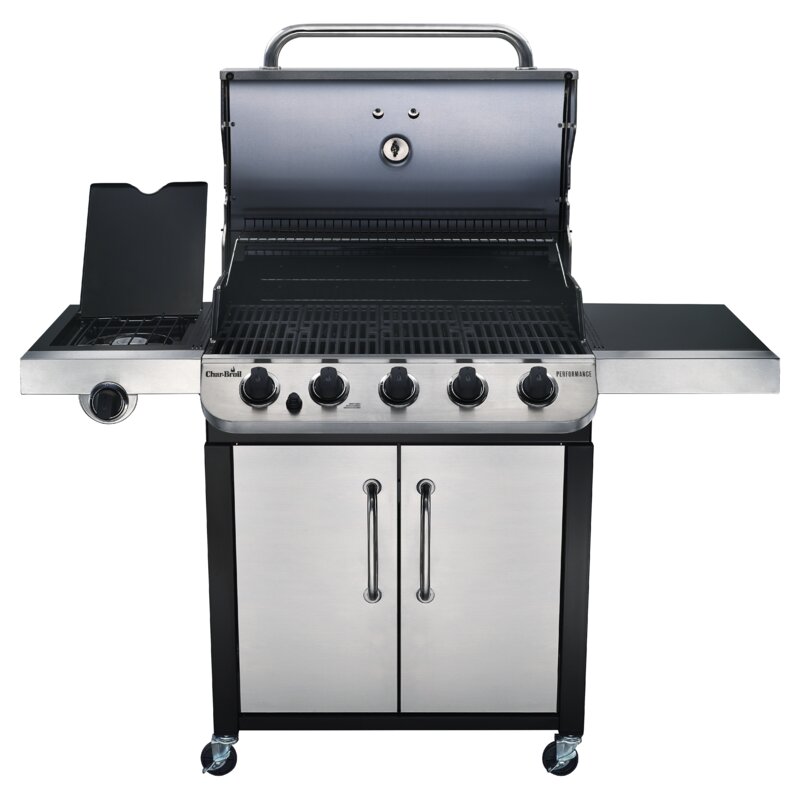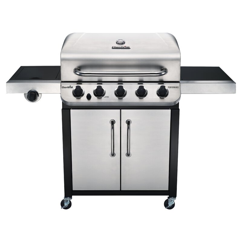 The Char-Broil Performance Series 5-Burner Propane Gas Grill packs a ton of grilling features into a sleek stainless cabinet design. This grill is large and made to last, with porcelain-coated cast iron grates that are rust-resistant and easy to clean. All the features are here including a 10,000 BTU side burner, durable stainless steel burners, rust-resistant cast-iron grates, and a removable porcelain-coated grease pan for easy cleaning.
