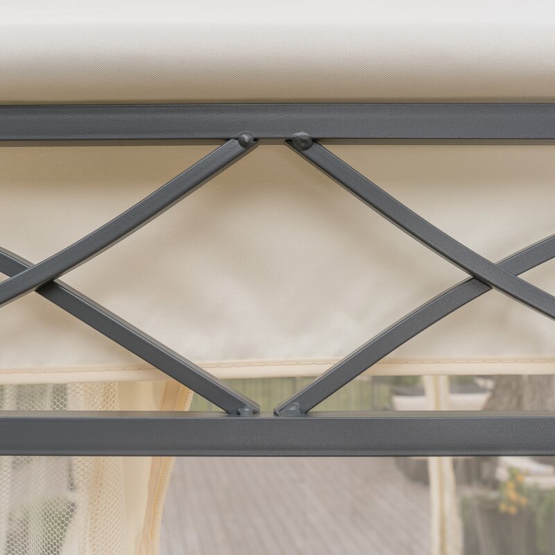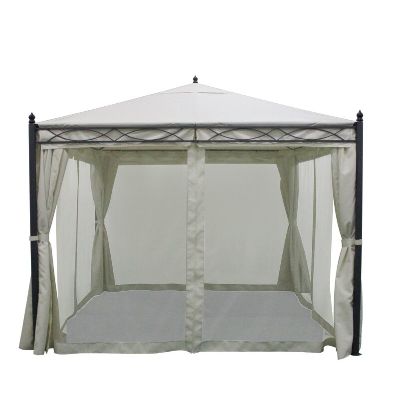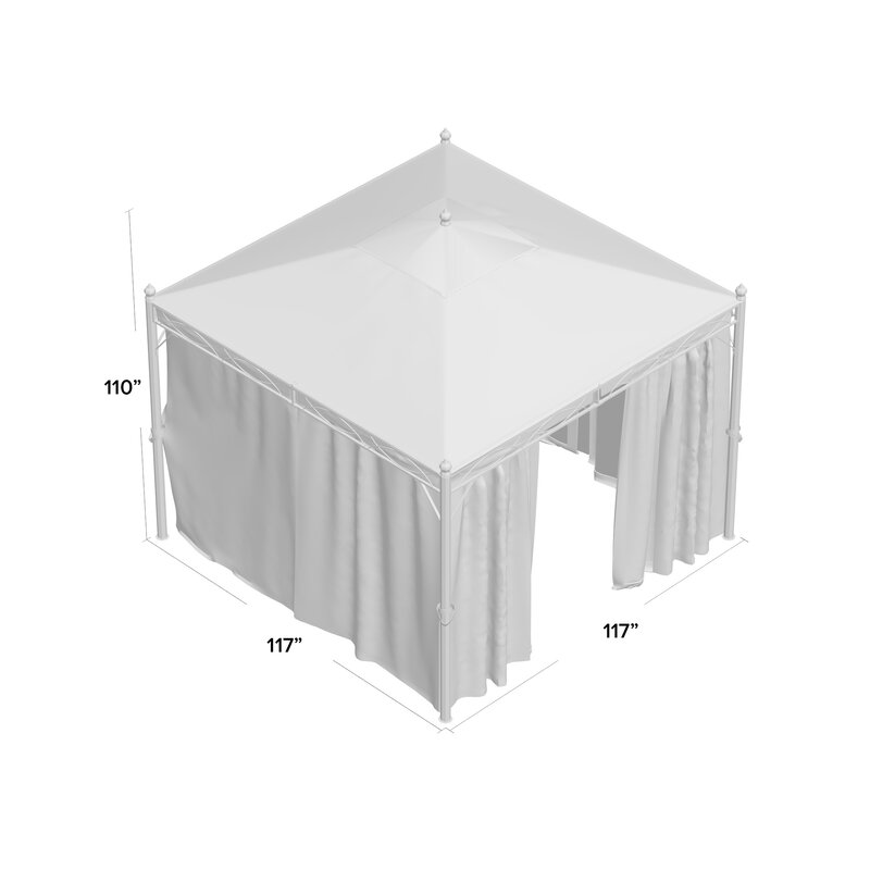Unwinding outdoors is enjoyable, but some elements can dampen the mood. Keep bright sunlight, summer rain, and pests from ruining your alfresco occasion with this gazebo! Designed to live outdoors, it pairs a steel frame with a 100% polyester canopy for a weather-resistant design that doesn’t mind UV light beaming down or rainstorms rolling through. Overall, it measures on the large side at 9′ 9” W x 9′ 9” D x 9′ 2” H.