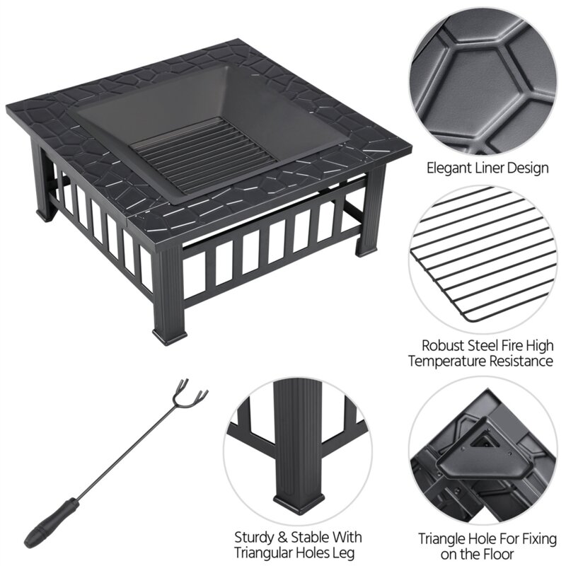 This fire pit is constructed of heavy-duty iron mesh and frame and built-in square shape for added stability. It comes with a mesh lid to prevent burning embers blowing and poker to stoke fire and remove the mesh lid safely. The sturdy design with special pattern makes it an ideal choice for heating, barbecue and cooling drinks and food in patio, garden, and yard.