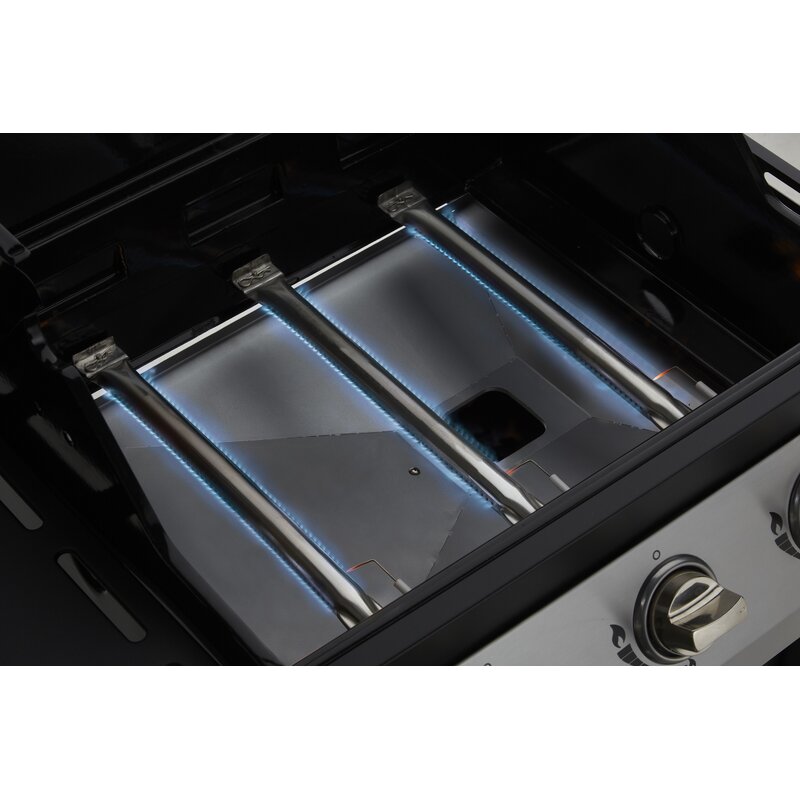 - Cooking space, (2) drop down tables and (3) stainless steel tube burners that provide 12,000-BTU’s each