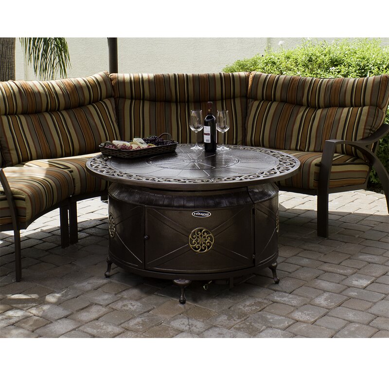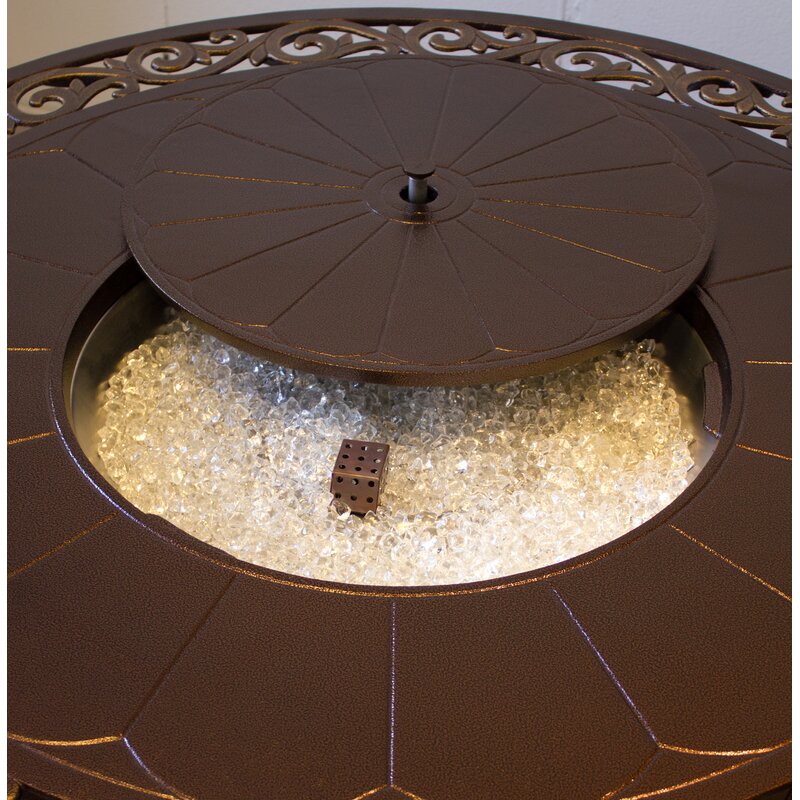 Add a little elegance to your backyard with this 48″ round Aluminum Propane Fire Pit Table with a decorative scroll design of hammered bronze and a touch of gold. In weatherproof cast aluminum, this intricately attractive Aluminum Propane Fire Pit Table centers around a stainless steel burner that emits 41,000 BTUs and a bowl full of glass fire beads. It easily conceals the 20lb. propane tank used to run the fire pit under the unit itself.