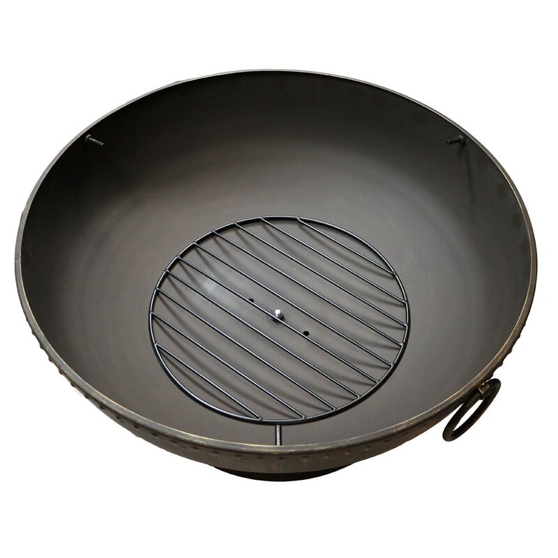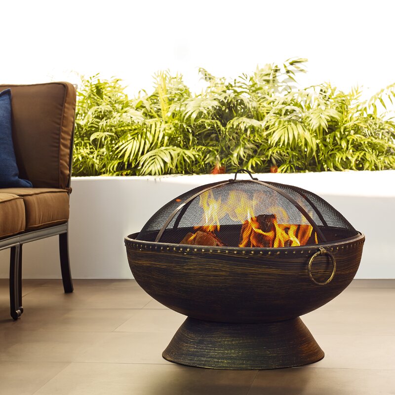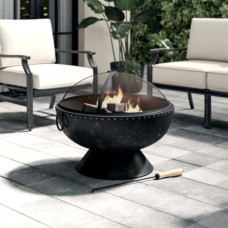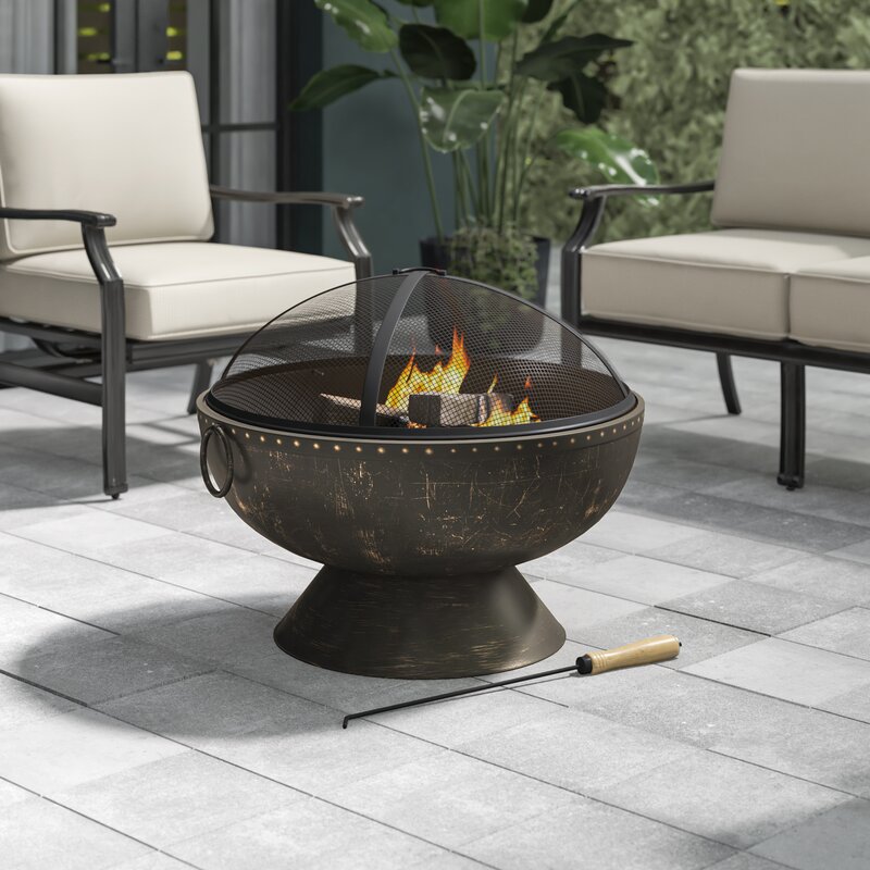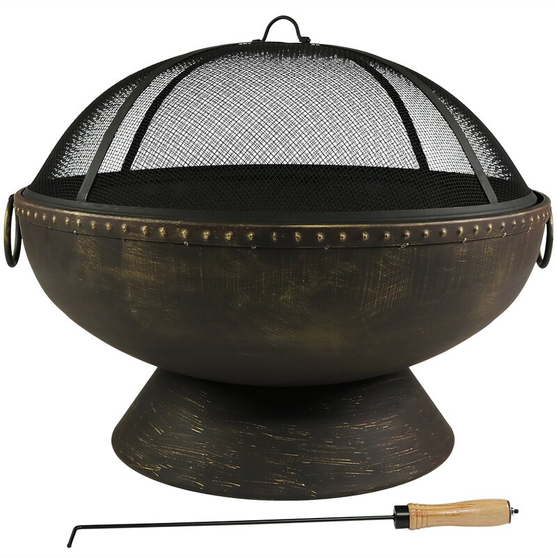 Create an instant social hub on the porch, patio, or backyard with this wood-burning fire pit! Offering a contemporary touch to any abode, this half-spherical design is crafted from steel in a distressed bronze finish and comes perched atop a tapered base. Two handles offer some easy transportation when you want to pack it up or simply create space, while a weather-resistant construction makes it the perfect addition to your outdoor arrangement.
